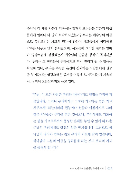 “그러나 어떤 사람은 이렇게 물을지도 모른다. 우리가 원하는 것을 꼬치꼬치 하나님께 알려드리지 않고, 우리의 뜻대로 단정하려고 애쓰지 않으면서 가장 좋은 것이 무엇인지를 결정하는 일은 하나님께 맡기는 것이 더 낫지 않은가? 하지만 결코 그렇지 않다! 예수님이 가르쳐주신 기도의 본질은 일단 한 번 소원을 말씀드리고는 나머지 결정을 하나님께 그냥 맡겨두는 것이 아니다. 믿음의 기도는 하나님의 뜻을 제대로 알 수 없을 경우에 드리는 순복의 기도와는 다르다. 믿음의 기도는 하나님의 말씀에 등장하는 여러 가지 약속에서 하나님의 뜻을 발견하고 드리는 기도이며, 그 약속이 성취될 때까지 끈질기게 간청하는 기도이다.”