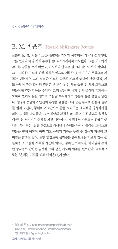그러기에 이 책에서 위대한 기도의 사람 바운즈는 간절한 기도에 관하여 이렇게 강조한다. “기도는 단지 무익하고 쓸데없는 행위나 단순한 의식이나 형식이 아니라 하나님께 응답을 달라는 요청이자 무언가를 얻기 위한 탄원이며, 하나님으로부터 위대한 선(善)을 찾는 것이다.” 그러면서 “그리스도인은 간구함으로써 살아간다. 기도는 그리스도인에게 반드시 필요한 호흡이다. 기도는 그리스도인의 풍족한 기업이며, 날마다 일상적으로 받는 연금이다”라고 덧붙인다. 그렇다. 우리의 기도는 날마다 일상적으로 받는 연금과 같은 것이다. 그러나 이 연금은 우리가 죽을 만큼 간절히 구할 때 비로소 내려지는 하나님의 은혜이다. 간절함이 없는 무미건조한 기도는 우리의 신앙을 무덤으로 만들며, 더욱이 그 신앙을 죽게 만든다. 그리고 하나님의 최고 영광과 우리의 최고선은 간절한 기도를 통해 확실히 담보된다.