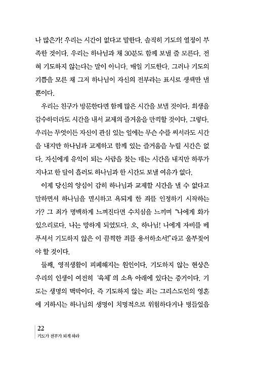 “기도하지 않는 것이 이토록 큰 죄인 까닭은 무엇일까? …영적생활이 피폐해지는 원인이다. 기도하지 않는 현상은 우리의 인생이 여전히 ‘육체’의 소욕 아래에 있다는 증거이다. 기도는 생명의 맥박이다. 즉 기도하지 않는 죄는 그리스도인의 영혼에 거하시는 하나님의 생명이 치명적으로 위험하다거나 병들었음을 입증한다. 교회가 그 부르심을 이행해서 교회 구성원들에게 영향력을 미치고, 그들이 세상의 모든 권세에서 벗어나 하나님을 향해 거룩한 헌신을 하도록 만드는 힘이 약화된 것에 관해 많은 말과 비판이 있었다. 또한 교회가 그분의 사랑과 구원을 알게 하라고 그리스도로부터 위임받은 많은 불신자에 대해 무관심하다는 말도 많이 있었다. 이처럼 이 세상의 수많은 그리스도인이 더 큰 영향력을 행사하지 못하는 결정적인 이유는 무엇인가? 기도하지 않음, 이것 외에는 없다. 사람들을 가르치고 교제하는 일에 아무리 충성했다 할지라도 학문에 관한 모든 열정과 교회 안에서의 모든 사역을 위한 성령의 분명한 약속과 하늘로부터 오는 권능을 받는 것에 직결된 쉼 없는 기도가 부족했다. 그렇기에 기도하지 않는 죄는 무력한 영적생활의 원인이다.”