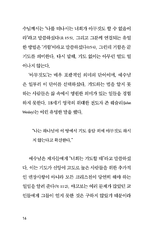 ‘아무것도’는 매우 포괄적인 의미의 단어이며, 예수님 은 일부러 이 단어를 선택하셨다. 기도하는 법을 알지 못 하는 사람들은 삶 속에서 영원한 의미가 있는 일들을 경험 하지 못한다. 18세기 영국의 위대한 전도자 존 웨슬리(John Wesley)는 이런 유명한 말을 했다.