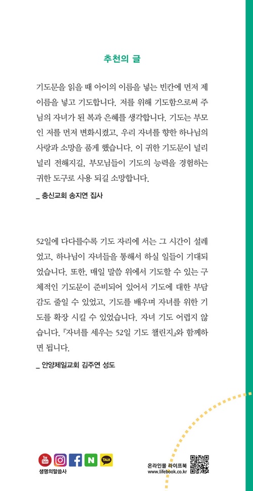 52일에 다다를수록 기도의 자리에 서는 시간이 설레었고, 하나님이 자녀들을 통해서 하실 일들이 기대되었습니다. 또한, 매일 말씀 위에서 기도할 수 있는 구체적인 기도문이 준비되어 있어서 기도에 대한 부담감도 줄일 수 있었고, 기도를 배우며 자녀를 위한 기도를 확장 시킬 수 있었습니다. 자녀 기도 어렵지 않습니다. 『자녀를 세우는 52일 기도 챌린지』와 함께하면 됩니다. 부모를 세우시고 자녀를 세우시는 하나님을 만날 수 있는 기도의 자리로 나아오시길 소망합니다. 하나님의 말씀을 토대로 만들어진 이 기도문이 수많은 엄마들에게 큰 도움이 될 줄로 믿습니다. _안양제일교회 김주연 성도