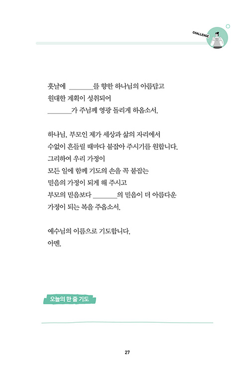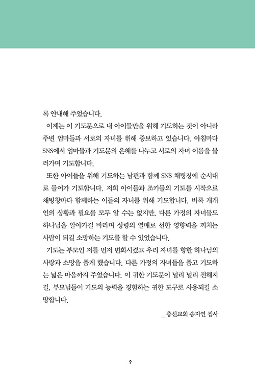 기도문을 읽을 때 아이의 이름을 넣는 빈칸에 먼저 제 이름을 넣고 기도합니다. 저를 위해 기도함으로써 주님의 자녀가 된 복과 은혜를 생각합니다. 이 기도문은 부모인 저를 먼저 변화시켰고 우리 자녀를 향한 하나님의 사랑과 소망을 품게 했습니다. 다른 가정의 자녀들을 품고 기도하는 넓은 마음까지 주었습니다. 이 귀한 기도문이 널리 널리 전해지길, 부모님들이 기도의 능력을 경험하는 귀한 도구로 사용되길 소망합니다. _충신교회 송지연 집사