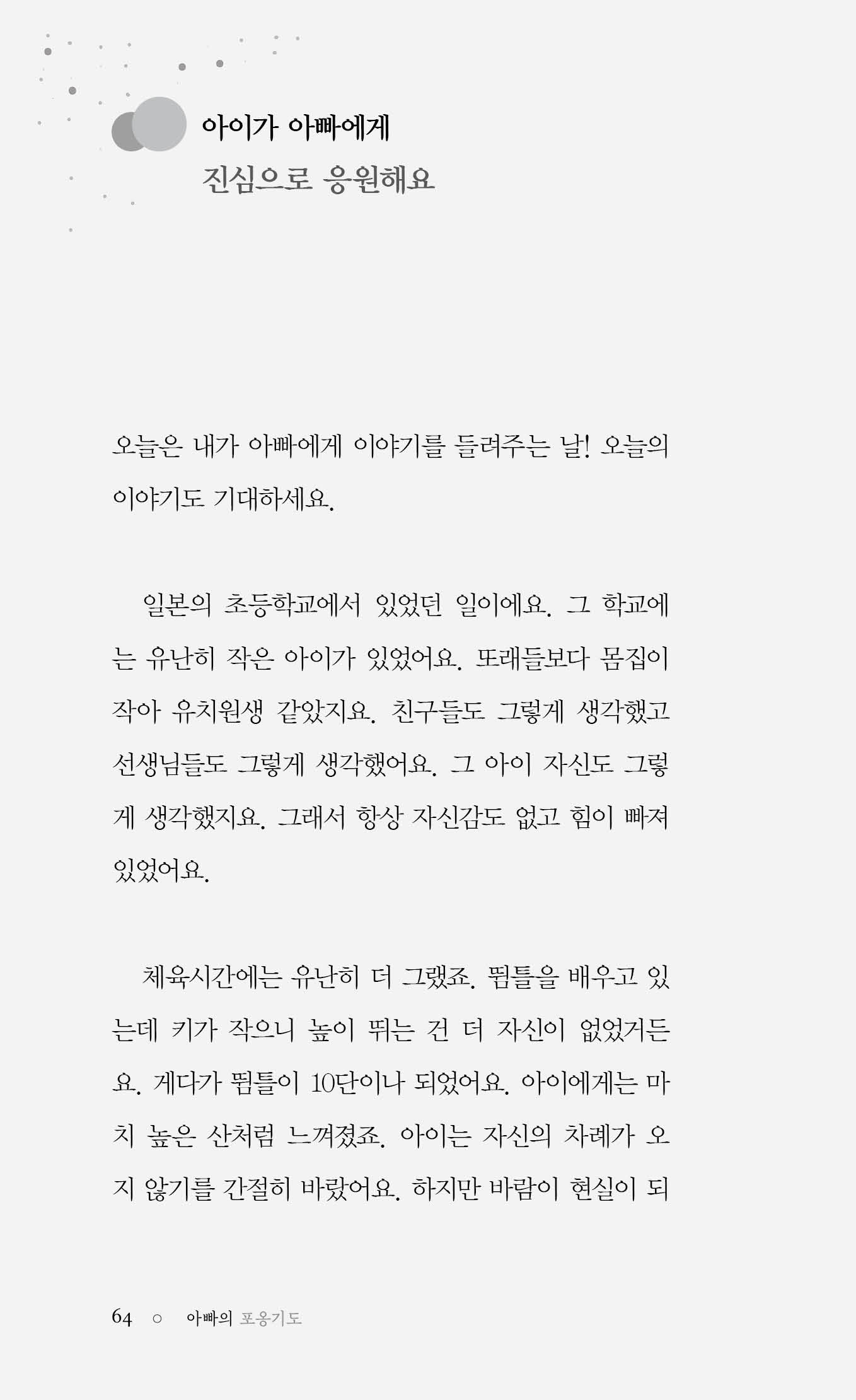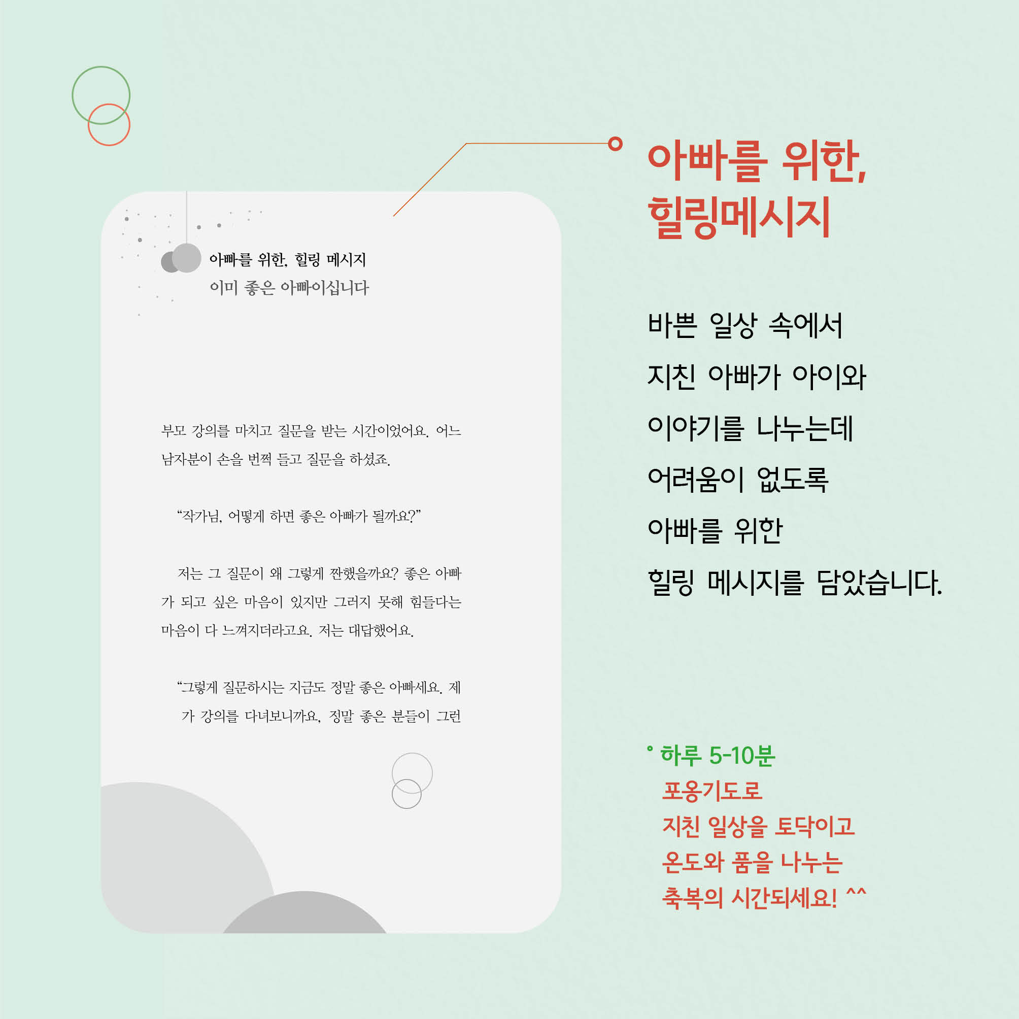 책의 중간중간마다 보이는 ‘아이가 아빠에게’는 아이가 아빠와 역할을 바꿔보는 곳입니다. 꼭 아이가 직접 이야기와 기도문을 읽게 해주세요. 위로라는 수고가 얼마나 벅찬 경험인지를 꼭 알게 해주세요. 저자가 아빠에게 주는 ‘힐링 메시지’도 절대 놓치면 안 됩니다. 그 부분은 정말로 아빠를 위해 쓰였거든요. 읽 으면서 정말 뭉클뭉클했습니다. 끝으로 저자의 말을 빌려 이 책을 읽으실 모든 아빠들에게 존경과 감사의 마음을 전합니다.