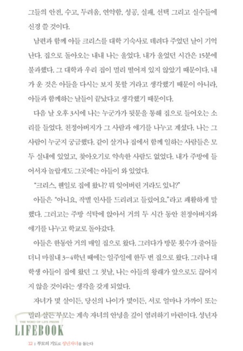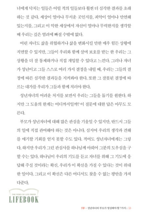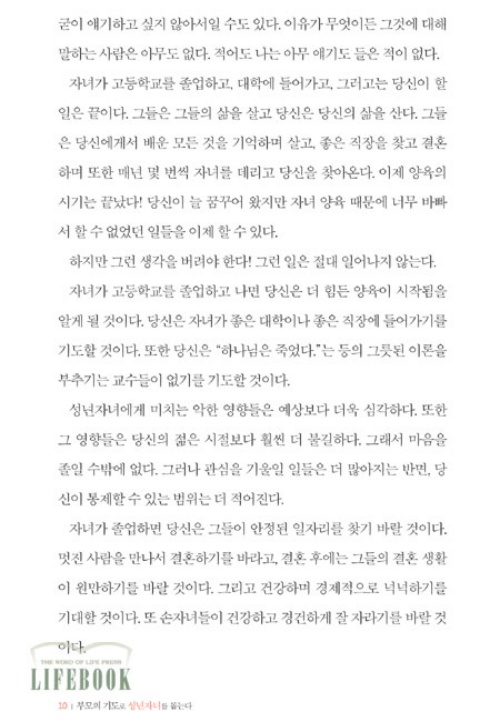 할 구체적인 기도제목들을 알려주고 있다. 직업 선택, 경제 문제, 배우자 선택, 결혼 문제, 자녀 양육 등 성년자녀를 둔 부모의