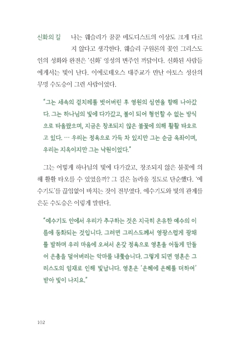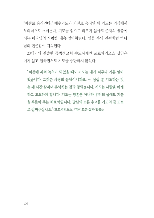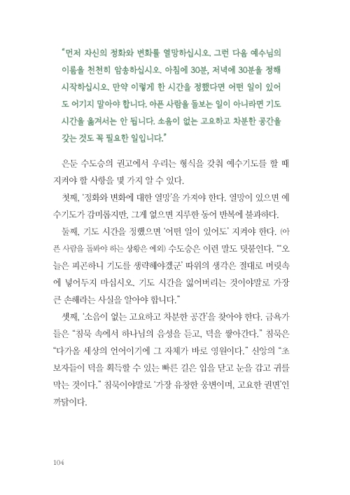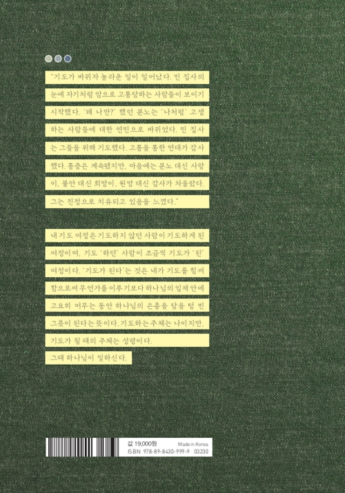 “내 기도 여정은 기도하지 않던 사람이 기도하게 된 여정이며, 기도하던 사람이 조금씩 기도가 ‘된’ 여정이다. 기도가 된다는 것은 내가 기도를 힘써 함으로써 무언가를 이루기보다 하나님의 임재 안에 고요히 머무는 동안 하나님의 은총을 담을 텅 빈 그릇이 된다는 뜻이다. 기도하는 주체는 나이지만, 기도가 될 때의 주체는 성령이다. 그때 하나님이 일하신다.”