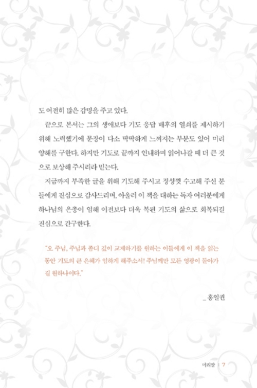 기도를 함께 배우고자 하는 작은 마음, 좀 더 하나님과 가까워지고 기도의 신비한 매력을 회복하고자 하는 소망으로 하나님 나라와 이웃을 위한 이타적 사랑과 섬김의 회복에 도움이 되기를 기도한다.