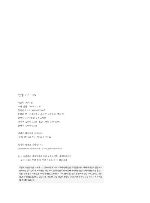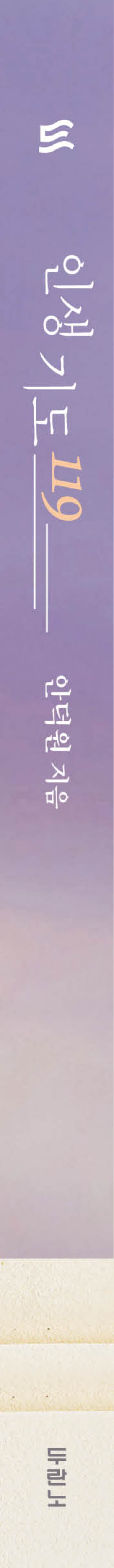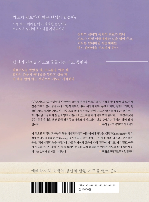 《인생 기도 119》는 인생의 시작부터 노년과 영원에 이르기까지, 우리가 살아 내야 할 모든 계절을 기도로 엮어 놓은 하나의 ‘영적 지도’입니다. 시작의 기도, 동행의 기도, 연단의 기도, 영원의 기도, 절기의 기도, 이 다섯 흐름 속에서 우리는 단지 기도의 언어를 배우는 것이 아니라, 하나님이 우리의 삶을 어떻게 이끌어 오셨는지를 다시 바라보게 됩니다. … 책장에 꽂아 두는 책이 아니라, 책상 위에 펼쳐 두고 계속해서 기도하며 길을 찾아가는 ‘동행의 책’이 될 것입니다.
