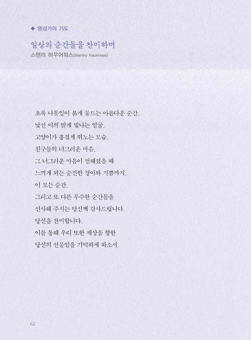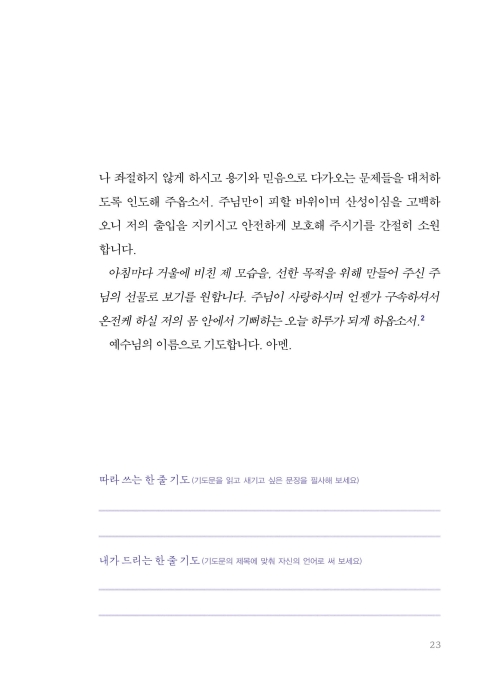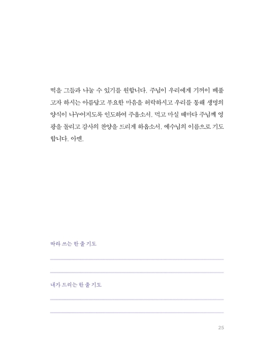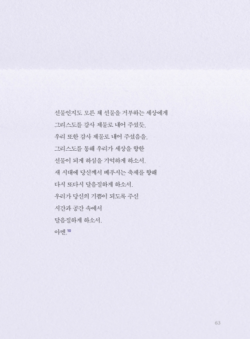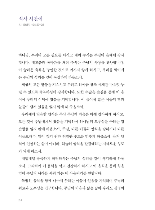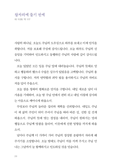 기도의 의미와 목적은 한결같습니다. 여러분이 드리는 기도가 우리의 눈을 주님께 맞추고 우리의 마음을 주님께로 향하게 하는 데 도움이 되고, 주님과 동행하는 여정에 친밀한 벗이 되기를 기대합니다. 우리의 영혼이 날마다 주님과 함께 호흡할 수 있기를, 주님 생명의 기운이 우리 안에 가득하기를 바랍니다. 그분의 임재 안에서 참 기쁨과 평안이 넘치기를 소망합니다. 무엇보다 성령께서 친히 우리를 위해 간구하신다는 사실을 잊지 않았으면 좋겠습니다. 기도문을 읽고 나누는 모든 분에게 성령의 조명과 어루만지심이 있기를 소망합니다.