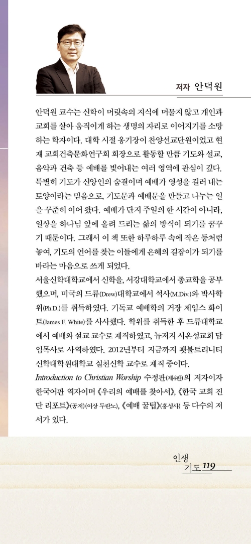 이 책은 횃불트리니티대학원대학교에서 기독교 전통에서의 예배와 설교 등 실천신학을 가르치는 안덕원 교수의 기도문집이다. 시대와 상황이 빠르게 변화되고 있기에 신앙의 본질은 동일해도 일상에서 드려져야 할 기도의 순간들은 세밀하고 다양해진다. 특히, 기대수명이 늘어나면서 노화와 질병의 시간들이 길어지고, 불안정하고 초예민한 현대 사회의 특징들은 기도생활에도 더욱 갈급한 제목들로 자리하게 된다. 바로 이 지점에서 저자는 현대 그리스도인들의 기도생활을 돕는, 실제적 기도문을 쓰게 되었다. 이 책은 그리스도인들이 살아가면서 만나게 되는 평범하고 일상적인 순간들, 막상 기도를 해야 하는데 어떻게 해야 할지 모르는 힘겨운 순간들을 위한 119편의 기도문집이다. 119는 삶의 모든 순간에 하나님을 요청하며 주권을 내어드리는 지향을 담고 있으며, 저자의 109편의 기도와 영성가들의 기도문 10편을 포함하여 119편을 뜻하기도 한다.