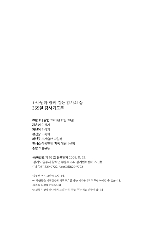 『하나님과 함께 걷는 감사의 삶 365일 감사기도문』은 완벽한 하루를 약속하지 않는다. 대신 흔들리는 하루를 다시 붙들 수 있는 언어를 제공한다. 감사가 감정의 고양이 아니라 삶을 견디는 신앙의 근육임을 깨닫게 하는 이 책은, 오늘을 살아가는 그리스도인에게 현실적이고도 깊은 동행서가 될 것이다.
