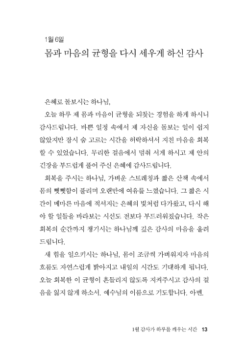 『하나님과 함께 걷는 감사의 삶 365일 감사기도문』은 특별한 순간의 고백보다, 평범한 하루를 버티게 하는 신앙의 언어에 주목한 기도서이다. 이 책은 감사가 성취의 결과나 긍정의 감정이 아니라, 흔들리는 일상을 지탱하는 신앙의 태도임을 차분히 보여 준다.