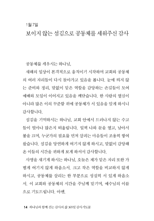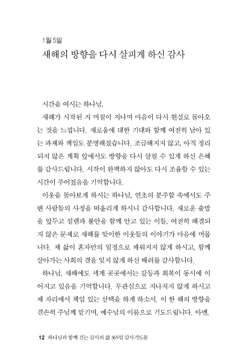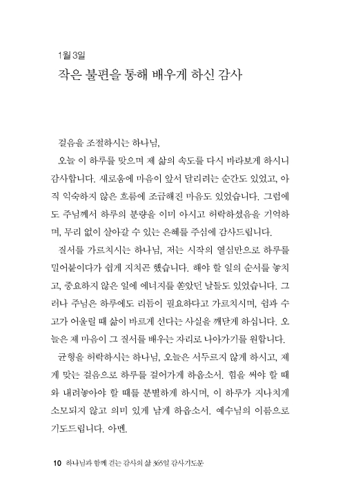 365일의 기도는 동일한 형식이나 감정에 머물지 않는다. 조급함, 피로, 불안, 관계의 긴장, 생계의 무게, 사회와 공동체에 대한 책임 등 일상의 다양한 결이 기도문 속에 자연스럽게 스며 있다. 감사는 정답이 아니라 그날의 삶에 대한 응답이라는 저자의 인식이, 매일의 기도를 통해 설득력 있게 드러난다.