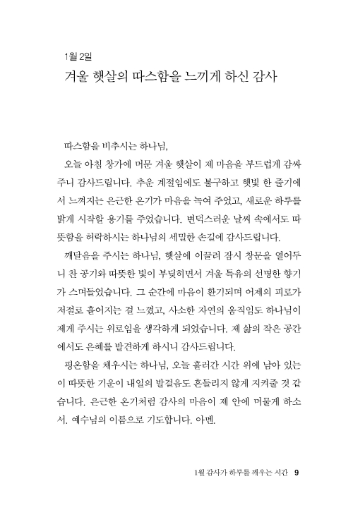 이 기도문들은 코로나19로 일상이 흔들리던 시기에 쓰이기 시작했다. 하루를 계획할 수 없고, 내일을 확신하기 어려웠던 시간 속에서 저자는 아침과 저녁, 하루를 붙들기 위한 기도의 언어를 기록해 왔다. 그 결과 이 책은 위로를 주기보다 현실을 회피하지 않는 감사, 삶을 미화하지 않으면서도 무너지지 않게 하는 감사의 신앙을 담아낸다.