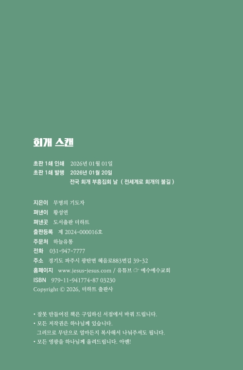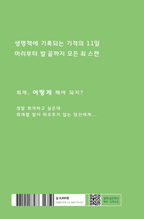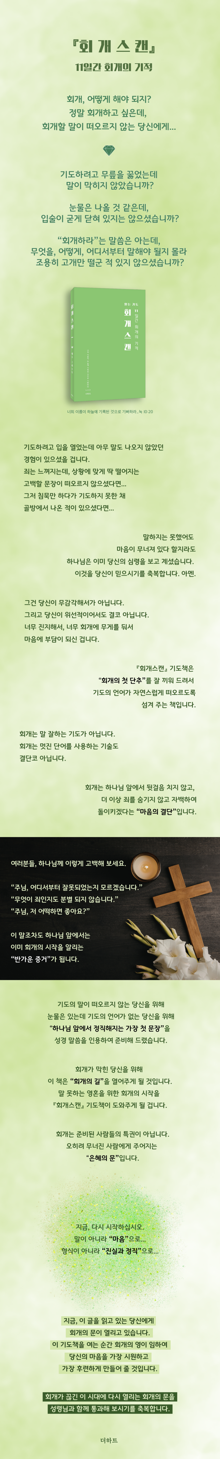 『회개 스캔』은 회개하고 싶지만 고백의 말이 떠오르지 않아 끝내 침묵해 버린 이들을 위한 11일 기도책입니다. 회개는 ‘말을 잘하는 기술’이 아니라, 하나님 앞에서 죄를 숨기지 않고 돌이키는 마음의 결단입니다. 이 책은 성경 말씀으로 시작해, 막혀 있던 회개의 첫 문장을 열어 줍니다.