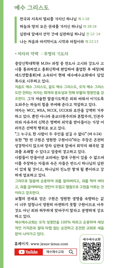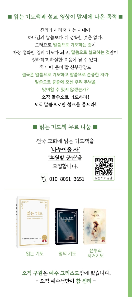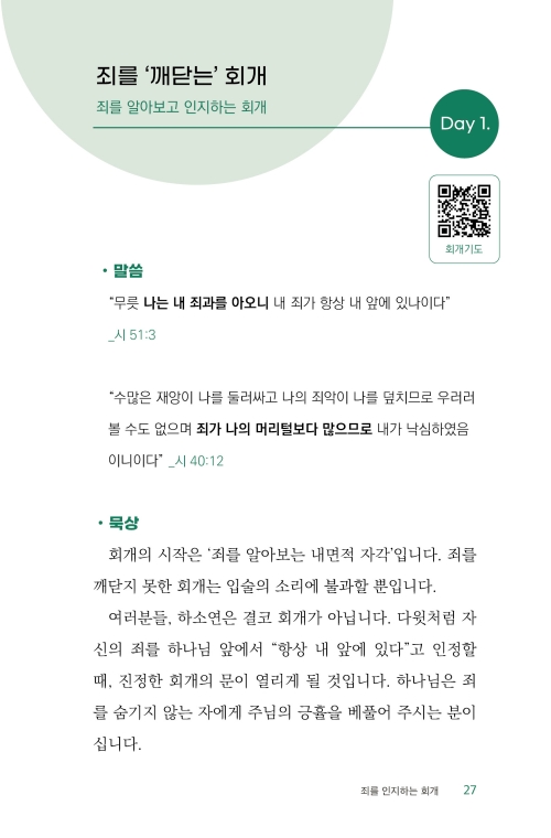 매일의 흐름은 말씀–묵상–회개기도문–대적기도와 선포–마음의 결단–실천 미션으로 이어집니다. 기도하다 멈춰 서던 사람도 자연스럽게 회개의 흐름 안으로 들어가, 조용히 읽고 묵상하며 소리 내어 기도하는 자리에서 결단과 실천으로 나아가게 됩니다. 11일의 여정을 따라 걷다 보면, 닫혀 있던 기도의 문이 다시 열릴 것입니다.