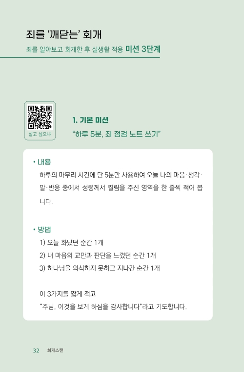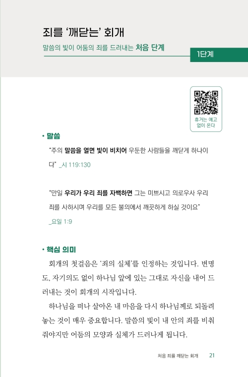 『회개 스캔』은 4단계 회개 여정으로 구성됩니다. 죄를 깨닫는 회개(Day1), 죄를 통회하는 회개(Day2), 죄에서 돌이키는 회개(Day3–10), 그리고 최고의 영광을 맞이하는 회개(Day11)까지. 하루 한 장씩 따라가며 회개의 길을 구체적으로 걸어가도록 안내합니다.