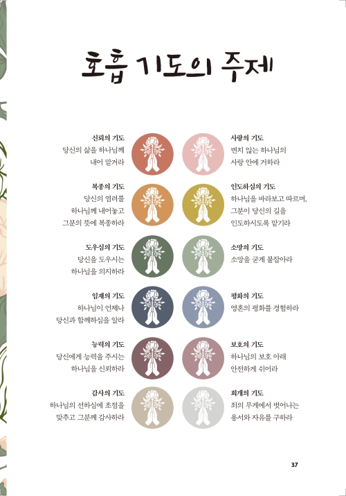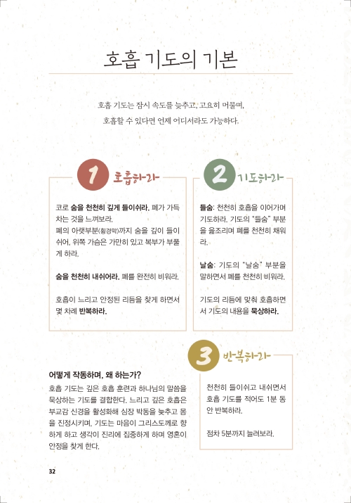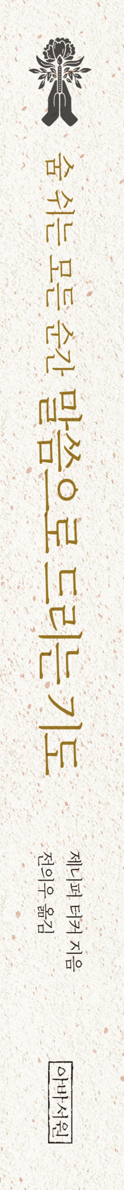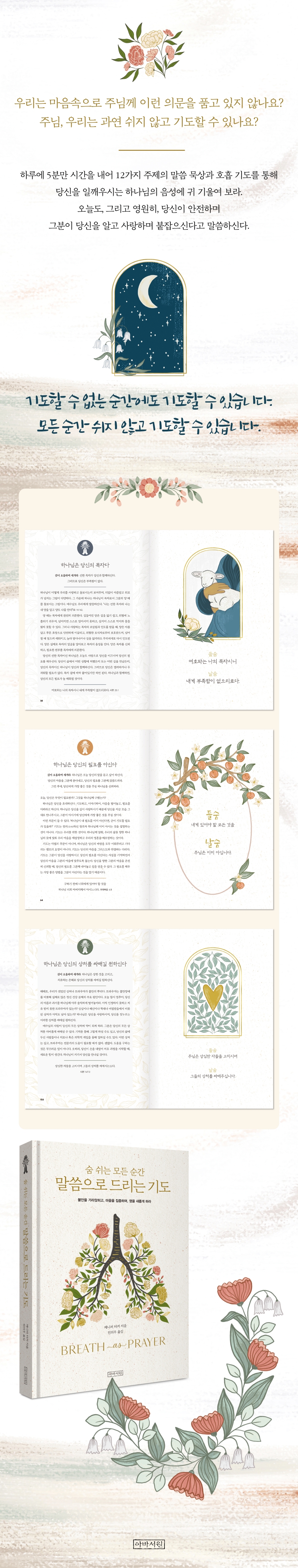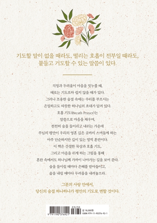 이 책은 초대 교부들로부터 내려온 오랜 영적 전통인 호흡 기도를 현대적인 감각과 과학적 근거를 바탕으로 재해석했습니다. 짧은 성경 구절을 입술에 담고 천천히 숨을 들이쉬고 내뱉는 과정 속에서, 우리의 요동치던 감정이 가라앉고 하나님의 임재 안으로 깊이 들어가는 경험을 하게 됩니다. 84개의 묵상글과 아름다운 일러스트는 우리의 모든 숨결을 평안의 기도로 바꾸어 줄 것입니다.