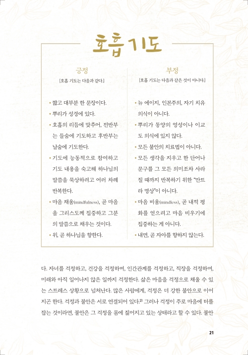 호흡 기도는 명상이 아닙니다. 우리 뇌의 신경계를 진정시키는 생리적 원리와 하나님의 말씀을 마음의 중심에 두는 영적 훈련이 결합된 형태입니다. 저자는 극심한 불안 속에서 자신을 붙들어준 이 실제적인 기도법을 통해, 독자들이 일상 속에서 즉각적으로 하나님의 평안을 누릴 수 있도록 안내합니다.