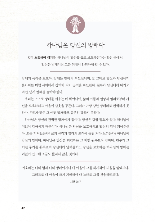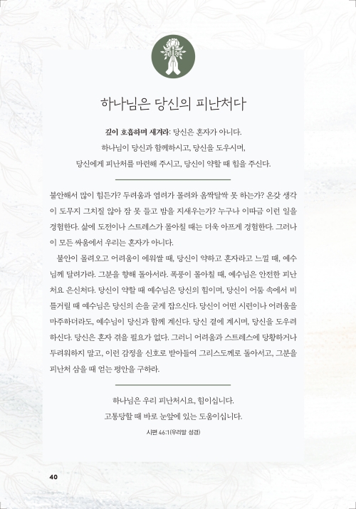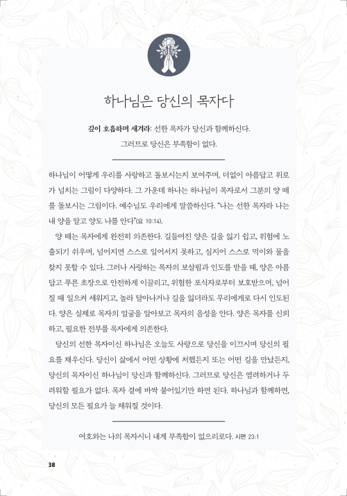 하나님의 목자 되심, 피난처 되심, 신실하신 사랑 등 우리 영혼에 꼭 필요한 12가지 주제를 84개의 묵상으로 담았습니다. 하루에 하나씩, 짧지만 강렬한 말씀과 기도를 따라가다 보면 어느새 불안은 물러가고 감사가 자리 잡게 됩니다.