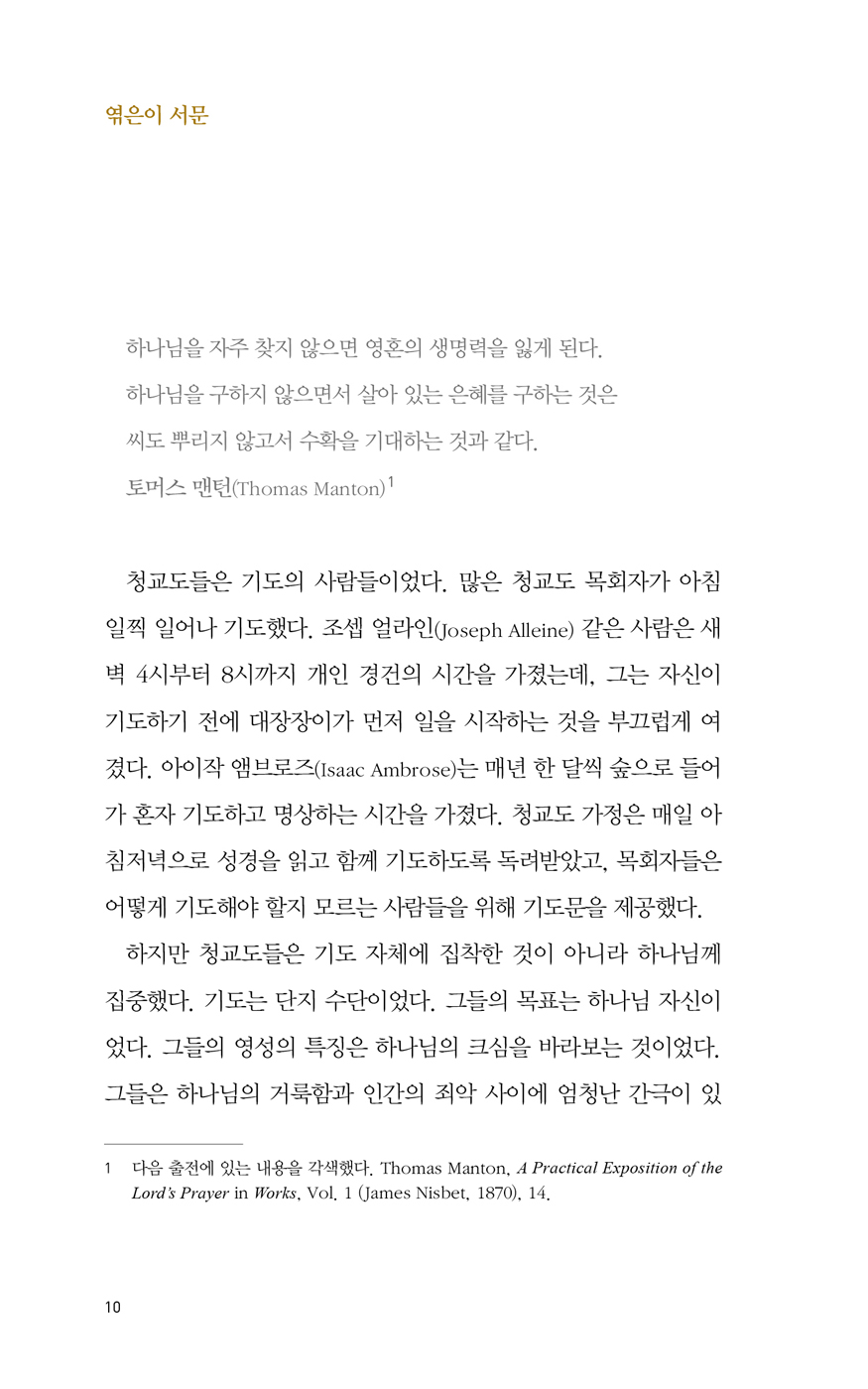 하지만 청교도들은 기도 자체에 집착한 것이 아니라 하나님께 집중했다. 기도는 단지 수단이었다. 그들의 목표는 하나님 자신이었다. 그들의 영성의 특징은 하나님의 크심을 바라보는 것이었다. 그들은 하나님의 거룩함과 인간의 죄악 사이에 엄청난 간극이 있다는 것을 철저히 인식했다. 하나님이 그리스도 안에서 우리에게 베푸신 은혜가 없었더라면 우리는 이 간극에 빠질 수밖에 없었을 것이다. 그들의 기도에서 우리가 반복해서 보게 되는 것은 우리 죄에 대한 깊은 인식과 지극히 큰 그리스도의 사랑에 대한 감사다. 그들이 하나님의 크심을 강조했다고 해서 하나님을 멀리 계신 분으로 인식했다는 의미는 아니다. 오히려 정반대다. 하나님은 그들의 삶 전체에 스며들어 계셨다. 청교도들은 하나님의 섭리를 깊이 이해하고 있었다. 그들이 누리는 모든 편안함은 하나님의 손에서 나온 것이기에 감사로 받아야 했다. 고난마저도 그분의 신묘막측한 계획의 일부였다. 일상의 기도에서부터 노동과 가정생활에 이르기까지 모든 삶은 하나님의 도우심으로 가능하기에 하나님 앞에서 살아야 했다. [중략] 청교도들이 그들의 신앙에 진지했던 것은 사실이다. 하지만 이 책에 나오는 기도문들이 보여주듯이, 그들은 삶을 즐기기도 했다. 그들은 하나님이 음식과 재미와 우정을 주신 것에 감사했다. 더 나아가 그들은 하나님을 즐기기까지 했다. 그들은 하나님이라는 즐거움을 추구했다.