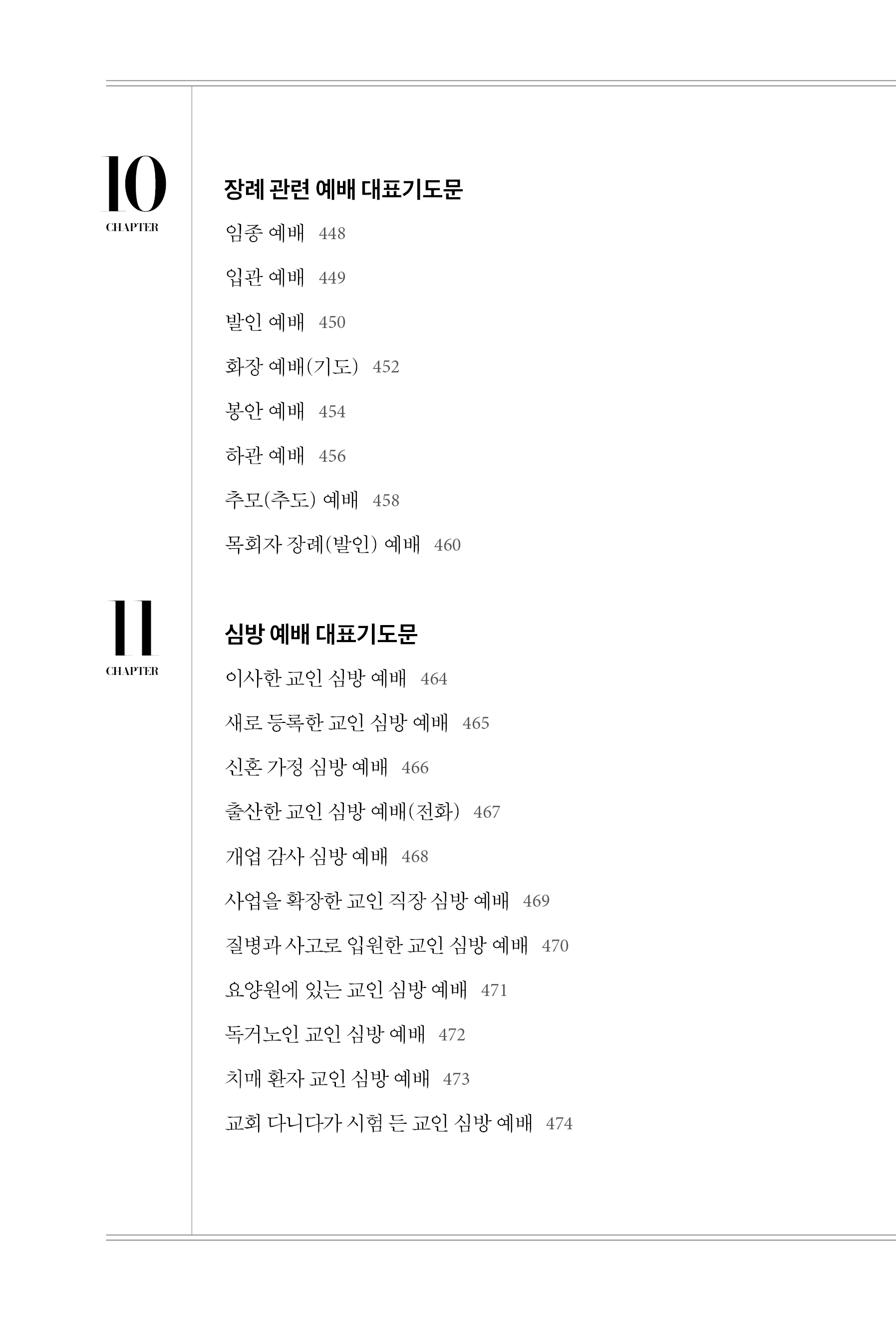 5_ 구역(속회, 목장, 셀, 순) 예배와 각종 모임, 생일, 백일, 결혼 감사 예배와 장례를 위한 예배 대표기도문도 자세한 항목과 함께 수록하였다.