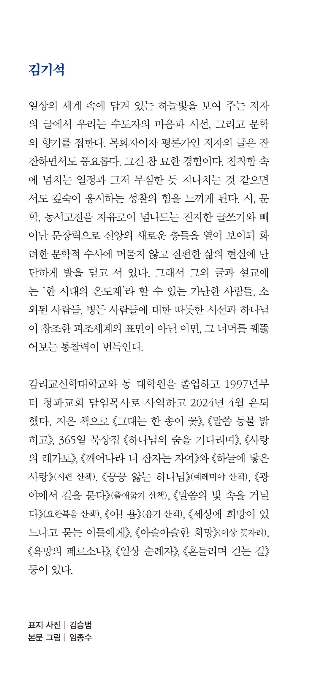 이 책은 저자가 매일 아침 성경 말씀을 읽고 묵상하면서 쓴 짧은 기도문을 엮었다. 일상과 말씀이 만나는 지점에서 저절로 터져 나온 짧은 신음인 동시에 질문이다. 길을 잃지 않으려는 몸부림이다. 기도는 간절히 바라는 바를 하나님께 청하는 일이기도 하지만, 마땅히 걸어야 할 삶의 길을 하나님께 여쭙는 일이기도 하다. 하늘에 길을 조회할 때 중력처럼 우리를 아래로 잡아당기는 욕망의 인력이 느슨해진다. 자아의 감옥으로부터 벗어나려는 사람은 기도하지 않을 수 없다. 욕망의 문법이 충돌하는 일상 속에서 바장이다보면 마땅히 있어야 할 자리에서 멀어지고 있음을 아득히 깨닫곤 한다. 날마다, 순간마다 하늘에 길을 묻지 않으면 표류할 수밖에 없다. 기도는 우리 삶 전체를 하나님 앞에 드러내 보이는 일이다. 기쁨과 슬픔, 희망과 절망, 권태와 열정, 우리 마음을 뒤흔드는 파괴적 분노까지도 주님께 내보일 때 치유가 시작된다. 일상에서 벌어지는 모든 일들을 하나님께 가져갈 때 일상은 돌연 하나님의 마음과 만나는 현장이 된다. 굳이 유창한 언어가 아니라도 괜찮다. 주저하고 머뭇거리는 언어면 어떤가? 우리가 기도를 바치는 대상은 땅에서 들려오는 신음소리조차 기도로 들으시는 분이다.