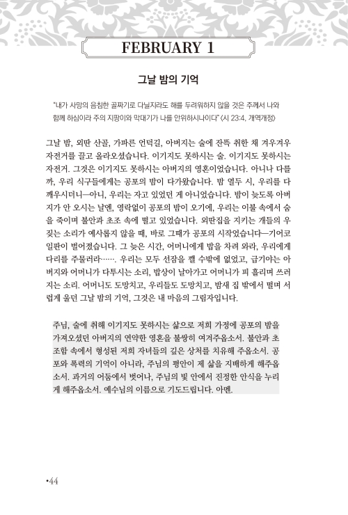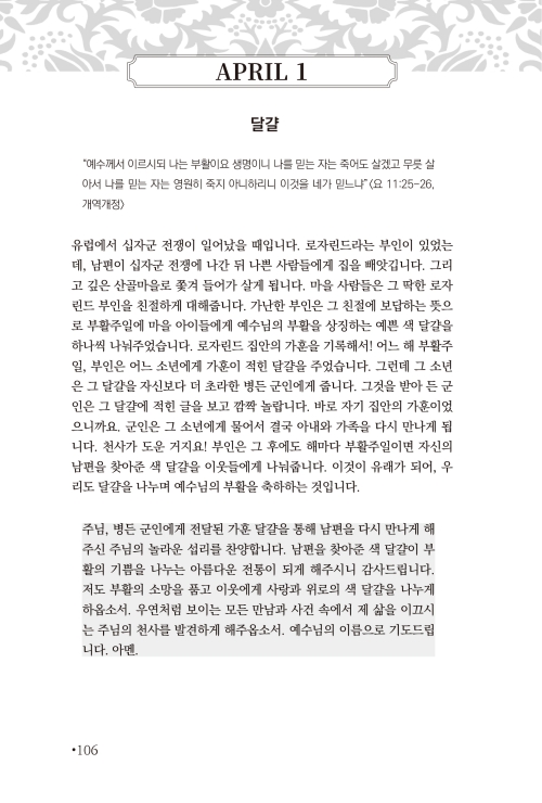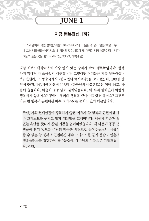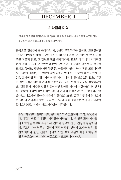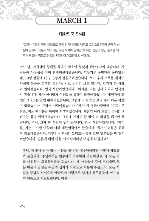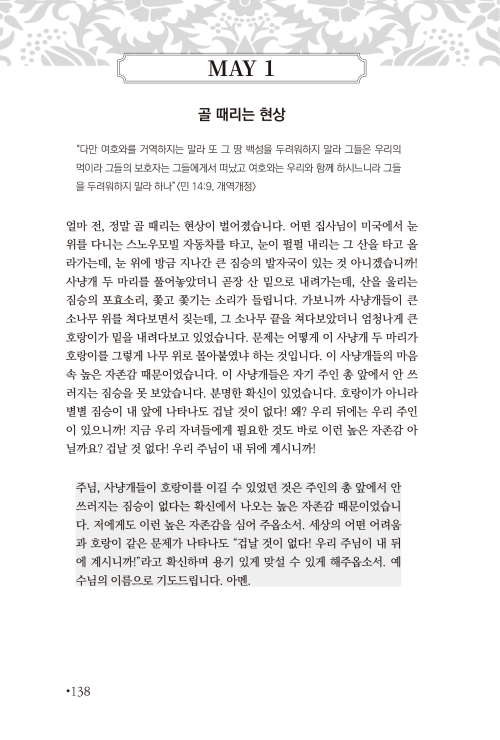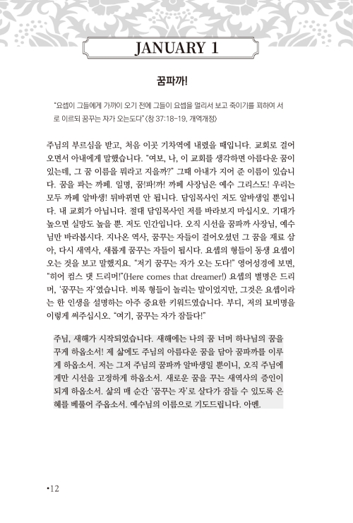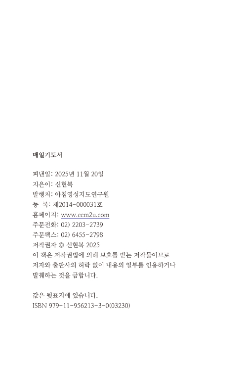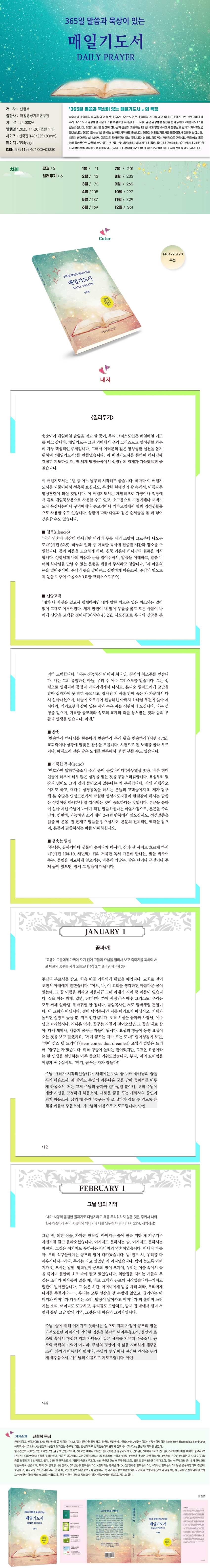 송충이가 매일매일 솔잎을 먹고 살 듯이, 우리 그리스도인은 매일매일 기도를 먹고 삽니다. 매일기도는 그런 의미에서 우리 그리스도교 영성생활 가운데 가장 핵심적인 주제입니다. 그래서 깊은 영성생활 실천을 돕기 위하여 <매일기도서>를 만들었습니다. 매일기도서를 통하여 하나님께 간절히 기도하실 때, 전 세계 방방곡곡에서 성령님의 임재가 가득했으면 좋겠습니다.
