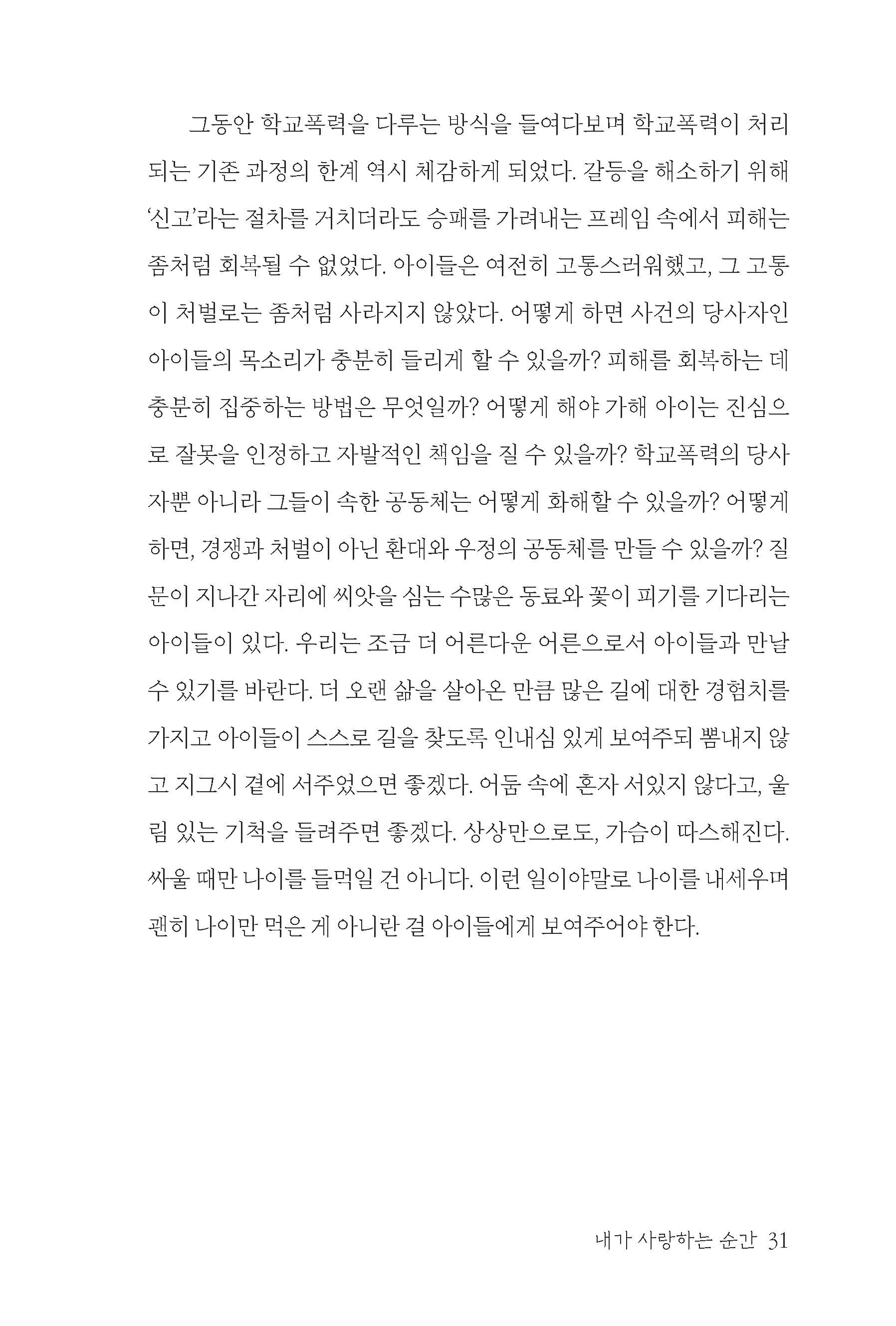 고통을 회피하게끔 시스템 뒤에 숨기는 것이 아니라 갈등의 풍랑을 잘 헤쳐갈 수 있도록 나침반이 되어주는 것이 어른들의 역할이다. 어른들이 책임을 회피하면 할수록 아이들은 갈등 속에서 길을 잃게 될 것이다.