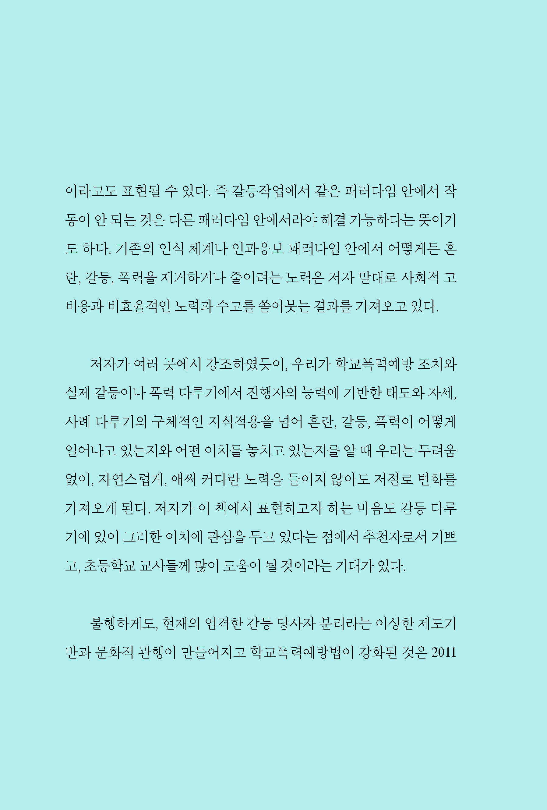 저자는 학교폭력을 사법 전문가나 어른의 판단하는 마음이 아니라, 다시 어린이의 마음으로 연결하고 있다. 이렇게 이해하기 시작하면 복잡하게 보였던 것들도 단순해지고 명확히 보이게 될 것이라는 믿음 때문이다. 이 책이 초등교사들께 위로와 지혜가 될 것이라는 충분한 기대가 있다.