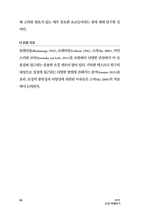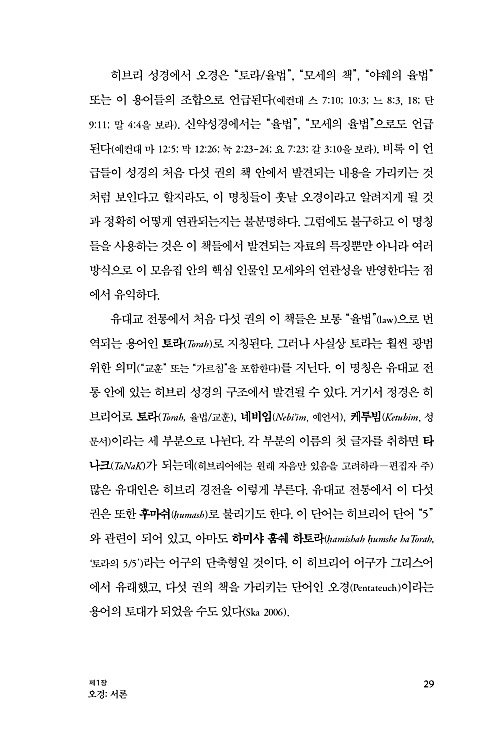 지금까지 우리나라에 소개된 오경 관련 저서와 역서들은 출간된 지 꽤 오랜 시간이 지난 것들이 대부분이다. 이 책은 2017년에 출간된 대중적 학술서이다. 오늘날 새로운 학설이 난무한 오경 학계에서 최근 이론들이 정제되고 정돈된 교과서 같은 책의 필요성이 절실한 실정이다. 이 책은 전 세계적으로 최신의 오경 학술 이론이 총망라된 보배 같은 책이다. 최신의 연구 동향과 방향이 담긴 교과서라고 할 수 있다. 이런 면에서 이 책은 오경을 처음으로 진지하게 공부하려는 독자들에게 최적화된 오경 입문서다.