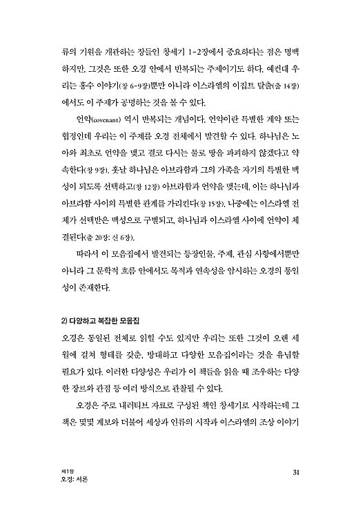 최근 성서학의 움직임은 통시적인 접근에서 공시적 접근으로 방향을 틀고 있다. 즉 역사비평적 해석에서 문학비평적 해석으로 넘어가는 추세다. 그렇다고 해서 이것이 역사비평을 무시하거나 배제하는 것은 아니다. 본문의 기원과 형성 과정에 주목하는 역사비평적 해석을 기본으로 하고 거기서 더 나아가 현재 독자들의 눈앞에 있는 최종 본문의 문학적 해석까지 추구한다는 것이다. 이 책은 이 두 가지 작업을 충실히 수행한다. 그런데 여기서 한 단계 더 전진한다. 독자 중심의 접근을 품고, 신학적 접근까지도 도모한다. 오경의 본문을 새롭게 해석한 최신 해석들이 한권의 분량으로 이렇게 많이 담겨있다는 것이 신기하다.