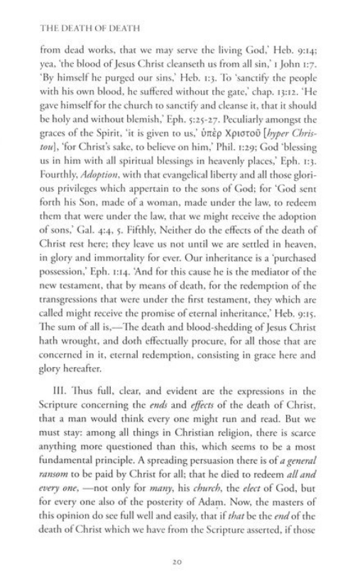 The Death of Death in the Death of Christ is a polemical work, designed to show, among other things, that the doctrine of universal redemption is unscriptural and destructive of the gospel. Those who see no need for doctrinal exactness and have no time for theological debates which show up divisions between Evangelicals may well regret its reappearance. Some may find the very sound of Owen's thesis so shocking that they will refuse to read his book at all. But there are signs today of a new upsurge of interest in the theology of the Bible: a new readiness to test tradition, to search the Scriptures and to think through the faith. It is to those who share this readiness that Owen's treatise is offered, in the belief that it will help us in one of the most urgent tasks facing Evangelical Christendom today-the recovery of the gospel.
