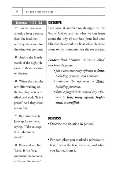 How do we free ourselves from the grip of fear and the accompanying stress that takes a toll on our lives physically, emotionally, mentally? In this 6-session study you'll discover the answer—an answer that will enable you to walk in faith and freedom, no matter what circumstances loom in your life. A 40-minute, no homework, inductive Bible study with text included from the NASB.