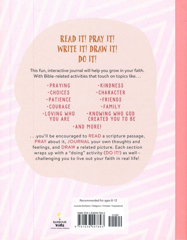 This fun, interactive journal will help girls grow in their faith. With Bible-related reading, praying, writing, drawing, and doing activities, the pre-teen girls in your life will enjoy the varied prompts. Touching on topics that will enhance a girl's faith, like Praying, Choices, Patience, Fitting In, Kindness, Emotions, Friends, Family, Loving Who You Are, Knowing Who God Created You to Be, and more, girls ages 8 to 12 will be encouraged to read a scripture passage (a key Bible passage is included), pray about it (a prayer starter is included), journal their own thoughts and feelings (a journal prompt is included), and draw a related picture (a drawing prompt is included). Each topically arranged section wraps up with a related "doing" activity as well—encouraging kids to live out their faith in real life!