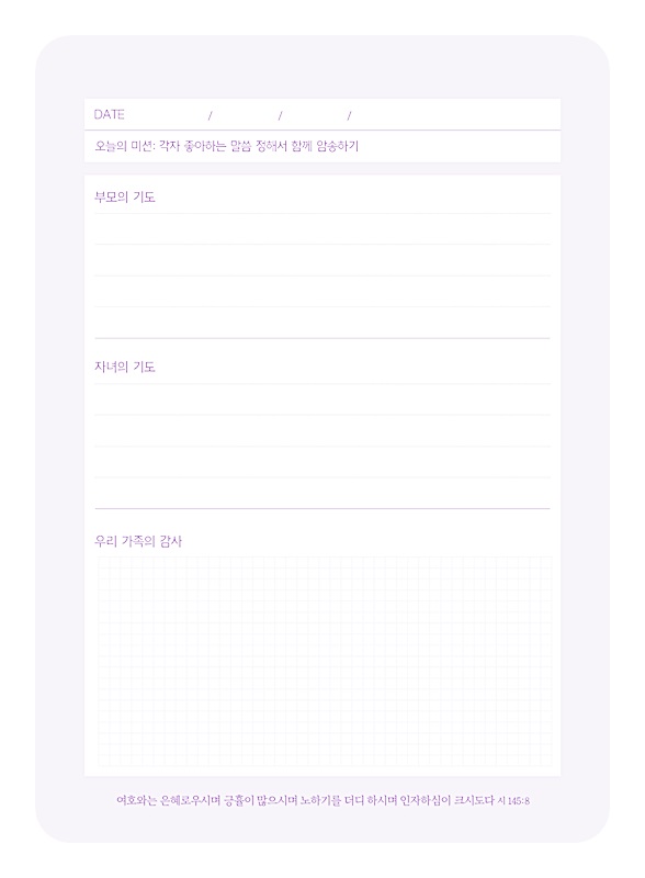 매일 저녁 온 가족이 함께 모여 하나님을 향한 기도와 감사를 적어 보십시오. 하루하루 시간이 쌓여 갈수록 가족 간의 사랑은 더욱 깊어지고, 우리 가족을 향한 하나님의 은혜도 날마다 새롭게 경험할 수 있을 것입니다.