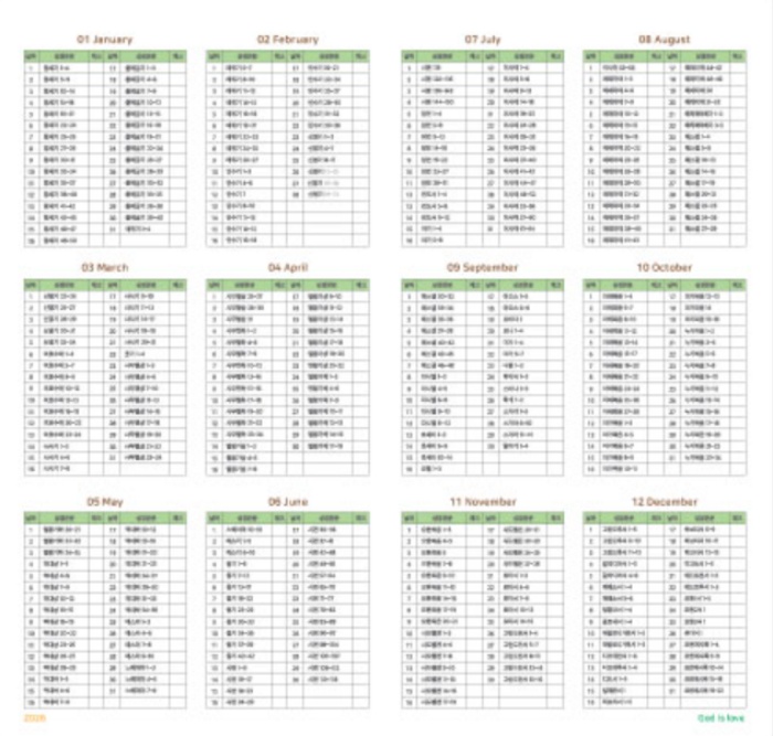 읽기표에 매일 주어진 그 날의 분량대로 성경을 읽으시면 1년에 일독이 가능합니다.