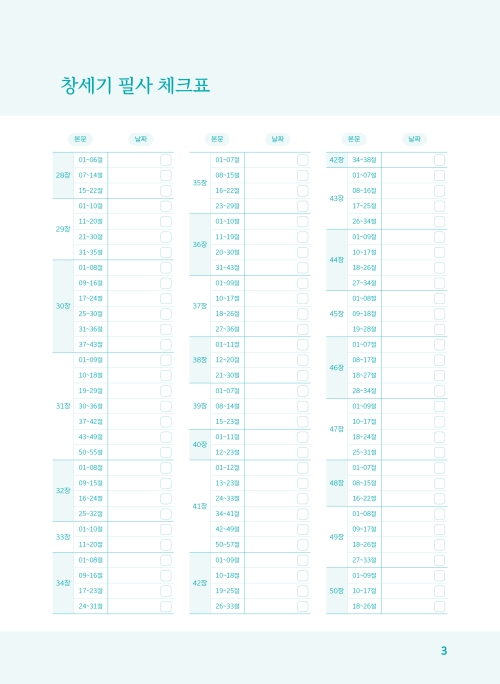 전체 창세기 필사의 진행 상황을 한눈에 확인할 수 있고, 체크표를 하루하루 채워가다 보면 성경 필사 완주에 동기부여도 받을 수 있습니다.