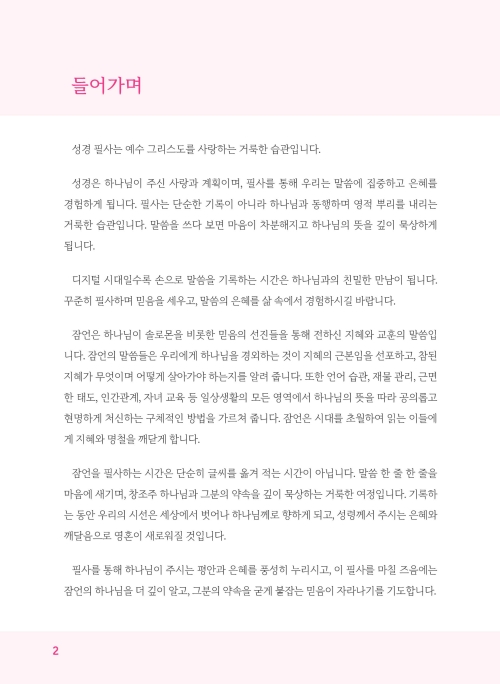 말씀을 천천히 음미하고 직접 써 보는 과정에서 하나님의 강력한 은혜와 임재를 경험하시길 바랍니다.