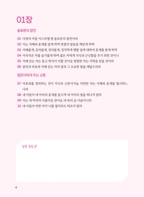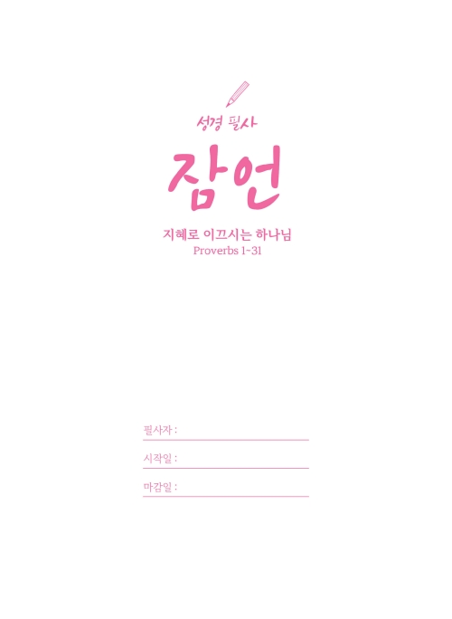 잠언은 하나님이 솔로몬을 비롯한 믿음의 선진들을 통해 전하신 지혜와 교훈의 말씀입니다. 시대를 초월하여 읽는 이들에게 지혜와 명철을 깨닫게 하는 잠언을 직접 쓰며 말씀과 깊이 있는 만남의 시간을 가져 보세요.
