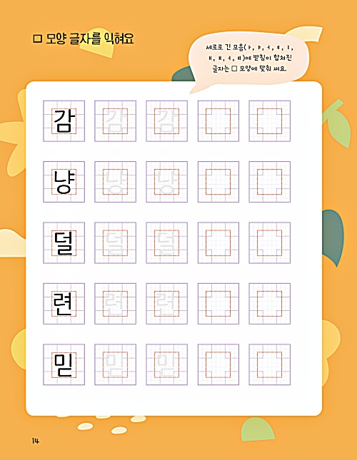 - 깍두기 칸에 또박또박 적으며 균형 잡힌 바른 글씨체를 익혀요.