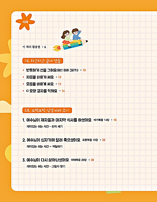 책의 구성대로 따라 쓰다 보면 선 긋기부터 단어 쓰기, 성경 따라 쓰기까지 하나님의 말씀 속에서 단계별로 차근차근 바른 글씨를 익힐 수 있습니다.