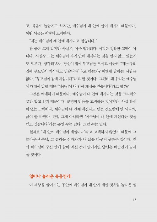 그 앞에서 초라한 내 모습, 교회의 모습을 바라보노라면 ‘예수 그리스도, 십자가 복음만으로는 안 된다. 현실은 어쩔 수 없어. 세상으로부터 인정받아야 해’라고 목까지 차오는 탄식을 억누르기 어렵다. 현실에 지치고 겁에 질린 사람들은 세상 눈치 보고, 두리번거리며 이론과 방법을 찾기에 급급하다. 그리고 이내 육적 자아의 욕구를 자극하는 자아사랑, 자기만족의 달콤한 향기로 다듬고 꾸민 예수님의 행복 시리즈 상품을 선택한다. 결코 넘어서는 안 될 세상과 교회의 경계를 허무는 복음의 대용품들을 취한다.