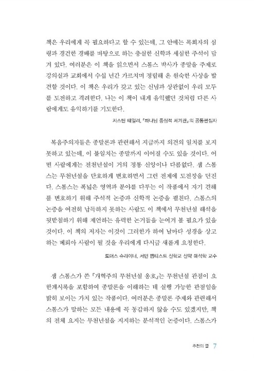 스톰스가 쓴 이 책은 크게 주목할 만한 작품으로서, 향후 몇 년 동안 무천년설 입장의 수호자로 자리매김할 것이 확실하다. 스톰스는 전천년설 견해들, 특히 세대주의 전천년설을 관대한 태도로 비판하는 데 남달리 뛰어난 재능이 있다. 스톰스는 후천년설이나 예언 성취론과 서로 의견을 나누는 방식에서도 이지적이고 통찰력 있는 면모를 보인다. 이 책은 내가 앞으로도 개인적인 연구나 목회 사역에서 몇 번이고 되풀이해서 다시 살피고 싶은 작품이다. 스톰스는 이해하기 쉽고 삶과 연결되는 온정적인 학식으로 교회를 섬기는 본보기를 우리에게 제공한다.
