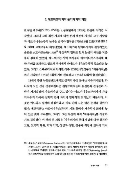 에드워즈의 고전적 철학 논쟁이 담긴 『자유의지』를 새로이 편집한 이 신판을 통하여 독자들은 이 중요한 원본의 내용을 간결하게 이해할 수 있을 것이며, 과거와 현재에 논쟁되고 있는 문제점들을 파악할 수 있을 것이다.