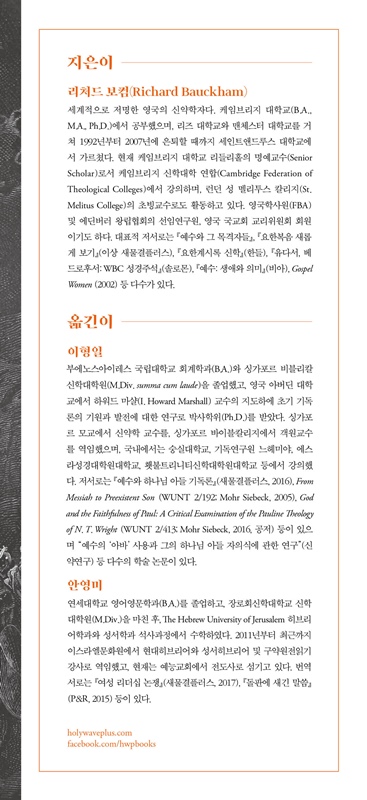 저자는 하나님의 유일하신 정체성과 예수를 일치시키는 기독론이야말로 초기 교회 신앙의 중핵으로서 신약성서의 버팀목임을 설득력 있게 제시한다. 새로운 관점으로 예수 연구를 견인하는 저자는 예수의 부활과 승귀뿐 아니라 그의 생애와 십자가상에서도 하나님의 정체성이 드러났음을 다각도로 증명하여 기독론 연구의 방향을 선도한다.