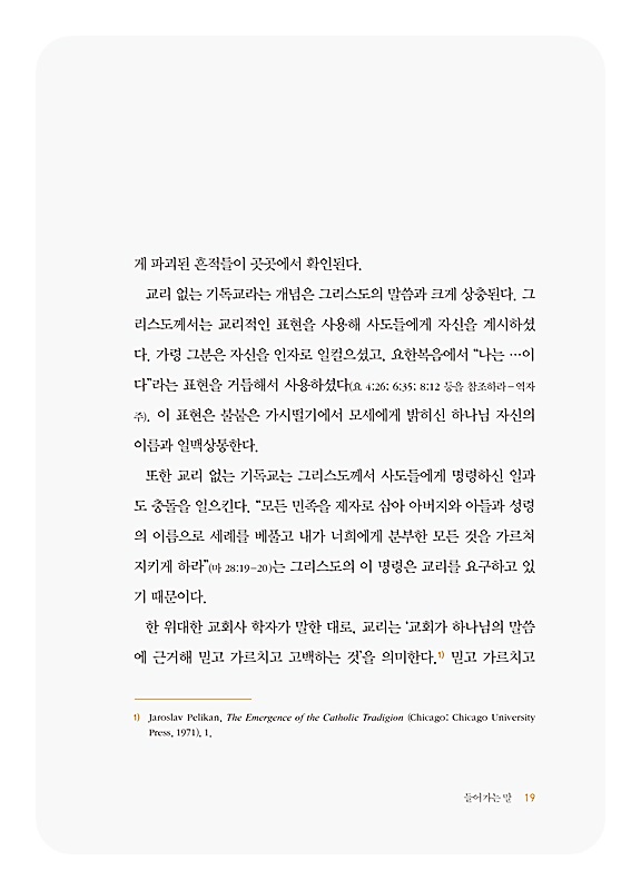 사도신경을 고백할 때 ‘공교회’라는 용어를 건너뛰고 싶은 생각이 들 수도 있다. 어떤 사람들은 이 용어를 암송하면서 그것이 로마 가톨릭교회나 교황의 통치를 의미하는 줄로 생각한다. 그러나 이 용어는 그런 의미가 아니다. 여기에서 공교회라는 용어는 ‘보편적’이라는 의미를 지닌다. 교회는 어디에 있든 동일한 교회다. 우리는 ‘기독교들’이 아닌 ‘기독교’를, ‘복음들’이 아닌 ‘복음’을 믿는다. … 교회의 보편성을 믿는다는 것은 장차 새 하늘과 새 땅에서 모든 시대의 신자들이 그리스도와 연합하게 될 것을 기대하면서도 지역 교회의 권위에 대한 근본적인 신념을 인정한다는 의미다. 다시 말해 ‘거룩한 공교회를 믿는다’는 고백은 개개의 지역 교회 안에 드러난 교회의 보편적인 속성을 고백하는 것이요, 복음을 지지하고 굳게 붙들면서 온 교회가 어린 양의 혼인 잔치에 함께 모이게 될 것을 기대한다는 의미다. … 사도신경은 거룩하고 보편적인 교회에 대한 고백에서 성도의 교제에 대한 고백으로 자연스레 이어진다. 거룩하고 보편적인 교회는 곧 성도의 교제를 의미한다. 사도신경은 개인주의나 ‘독자적인’ 기독교의 개념을 용납하지 않는다. 사도신경은 모든 신자에게 ‘영원하신 하나님의 영원한 가족에 속한 영원한 지체’라는 새로운 정체성을 의식하라고 요구한다. _ 12장 <나는 거룩한 공교회와 성도의 교제를 믿습니다> 중