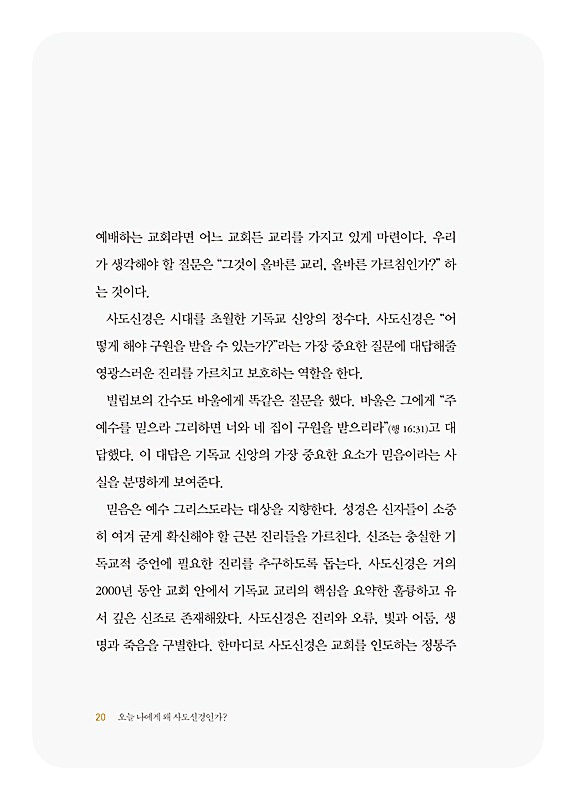 교회는 초창기부터 진리를 주장하고 오류를 논박해야 하는 이중적 도전에 직면해왔다. 그리고 오랜 세월 동안 참된 기독교를 정의하고 옹호하기 위해 다양한 형태의 신조와 신앙고백을 만들었다. 우리가 사도신경으로 알고 있는 신조는 십계명과 주기도와 더불어 오랫동안 변함없이 기독교 신앙을 가르치는 가장 중요한 도구 가운데 하나로 활용되어왔다. … 사도신경은 시대를 초월한 기독교 신앙의 정수다. 사도신경은 “어떻게 해야 구원을 받을 수 있는가?”라는 가장 중요한 질문에 대답해줄 영광스러운 진리를 가르치고 보호하는 역할을 한다. … 기독교 교리의 핵심을 요약한 훌륭하고 유서 깊은 신조로 존재해온 사도신경은 한마디로 교회를 인도하는 정통주의의 지표가 아닐 수 없다. _ 들어가는 말