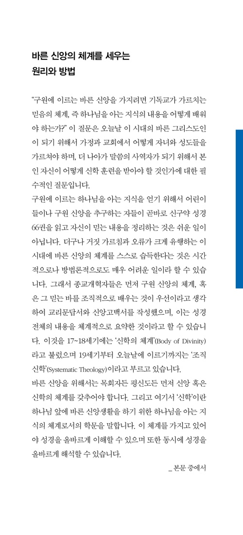 이 책은 거짓과 오류가 가득한 이 시대에 성경을 통해 바른 신앙을 체계적으로 배우고자 하는 자들이 올바른 구원 신앙과 신학의 체계를 세우는 데 도움이 되고자 쓴 것입니다. 따라서 종교개혁자들과 청교도들이 세운 신학의 체계를 따라가되 오늘을 살아가는 그리스도인과 바른 신앙을 추구하는 자들의 질문에 구체적으로 대답하고 있습니다. 더 나아가 그들로 신학의 체계를 굳건히 세워서 구속주(救贖主) 하나님을 아는 지식(saving knowledge of God)을 얻게 하는 일에 그 목적을 두었습니다. 또한, 교회에서 52주간에 걸쳐서 가르치고 배울 수 있도록 구성하였으므로 목회자나 평신도를 불문하고 조국 교회의 진리를 추구하는 그리스도인들이 바