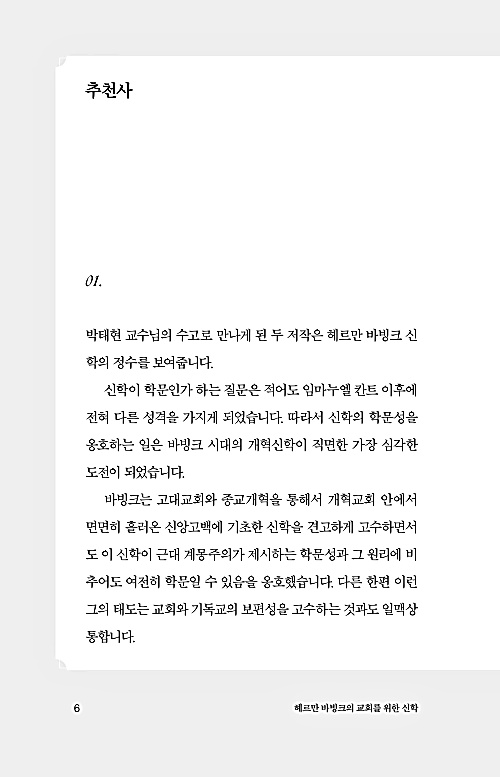 본서는 깜픈 초기 시절 바빙크가 사유하고 고민했던 생각의 흐름의 ‘알파와 오메가’가 고스란히 드러난 종합 선물 세트입니다. 종합 선물 세트는 늘 짜릿한 흥분감과 기쁨을 선사합니다. 정확한 번역과 친절한 설명 및 요약까지 곁들여진 이 놀라운 선물 세트를 누리지 못하는 것이야말로 반드시 피해야 할 최악의 악수(惡手)일 것입니다. 반드시 꼼꼼히 읽고 그 내용을 풍성히 누리시길 진심으로 바랍니다.