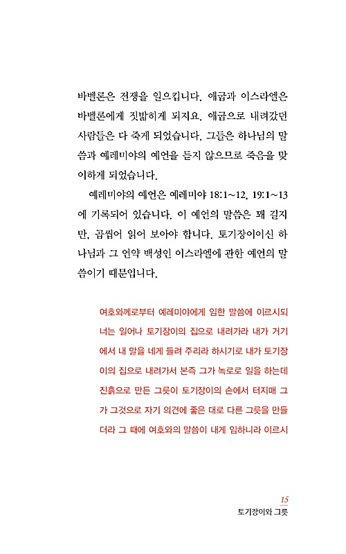 p42 하나님은 우리를 더욱 귀하게 쓰시려고 하십니다. 하나님은 우리를 귀한 그릇으로 빚으시기 위해 때로 불시험의 은혜를 허락하시기도 합니다. 이러한 불시험의 때에 토기장이 하나님이 우리를 깨끗한 빈 그릇으로 예비하시려는 뜻을 깨닫고 감사할 수 있기를 바랍니다.